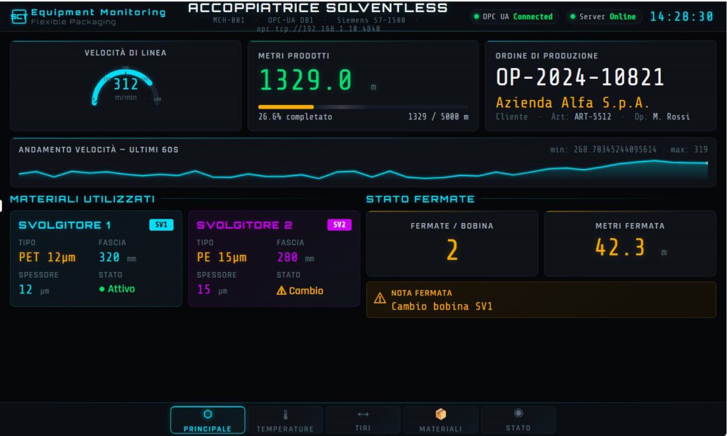 Control electrónico de la tensión de los materiales en entrada y salida, con sensores de alta precisión que aseguran estabilidad del proceso, mejor calidad del producto y reducción de desperdicios.